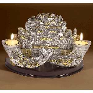 Een glinsterende weergave van Jeruzalem, de “Stad van Goud”. Deze verzilverde kaarsenstandaard brengt u een prachtig tafereel van deze mooie stad.